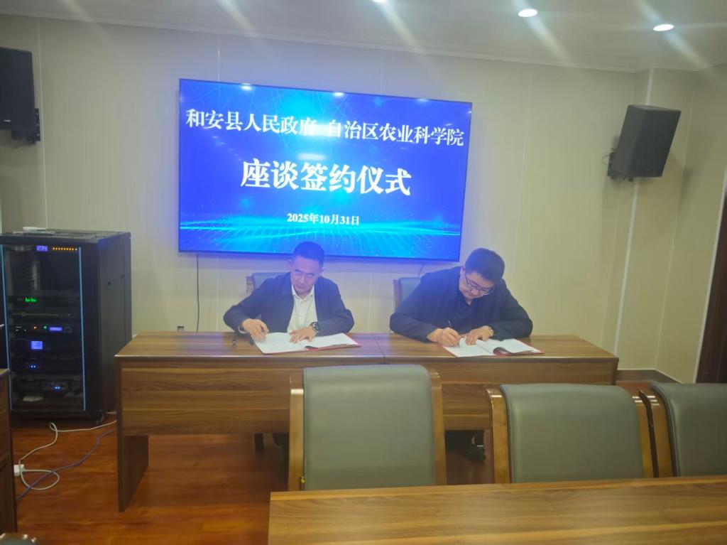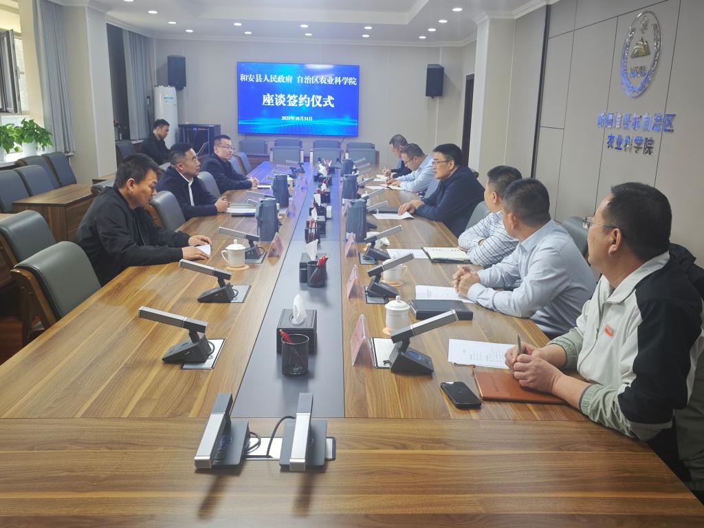 10月31日,和安县委副书记、县长雷中伟一行到自治区农科院座谈,并签订双方战略合作框架协议和共建“新疆高寒地区现代农业产业研究院”协议。座谈会由自治区农科院党组成员、副院长戴俊生主持。