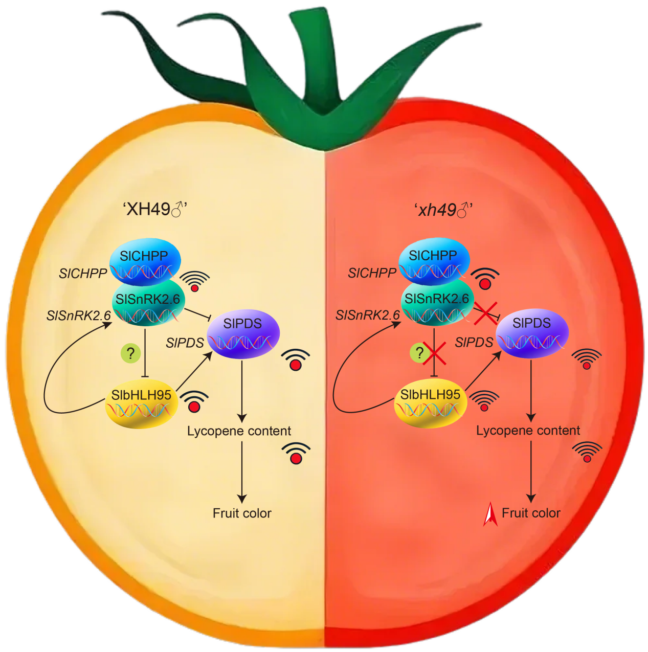 番茄果实鲜艳的红色主要来源于类胡萝卜素,尤其是番茄红素和β-胡萝卜素的积累,这些物质直接影响果实的外观品质与营养价值。本研究以加工番茄自交系“XH49♂”为材料,利用CRISPR/Cas9技术创制了SlSnRK2.6与SlCHPP双基因敲除突变体,发现其果实呈现显著的红色表型,且番茄红素含量大幅提升。通过整合靶向代谢组和转录组分析,揭示该突变体在果实成熟后期特异性地上调了八氢番茄红素和番茄红素的积累。进一步研究表明,转录因子SlbHLH95是调控类胡萝卜素合成的关键正向调节因子。分子实验证实,SlSnRK2.6、SlCHPP、SlbHLH95与合成酶SlPDS可在细胞核内形成蛋白复合体;SlSnRK2.6/SlCHPP可能通过磷酸化等翻译后修饰方式负调控SlPDS活性,抑制类胡萝卜素合成;SlbHLH95能直接结合并激活SlPDS、SlSnRK2.6和SlCHPP的启动子,促进其转录表达。基于此,研究提出一个“反馈-前馈”协同调控模块,其实现了对类胡萝卜素合成的动态精细调控。这项研究不仅深化了对果蔬色素代谢网络的理解,也为通过基因编辑手段定向改良果实色泽和营养品质提供了重要的理论依据和优良靶标基因。