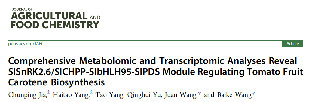 近日,自治区农科院果蔬研究所番茄生物育种创新团队在《Journal of Agricultural and Food Chemistry》(IF=6.2/Q1)在线发表了题为“Comprehensive metabolomic and transcriptomic analyses reveal SlSnRK2.6/SlCHPP-SlbHLH95-SlPDS module regulating tomato fruit carotene biosynthesis”的研究论文。该研究通过多组学联合分析,系统揭示了SlSnRK2.6/SlCHPP-SlbHLH95-SlPDS模块在调控番茄果实类胡萝卜素生物合成中的关键作用,为提升番茄果实色泽与营养品质提供了重要的理论依据和基因资源。