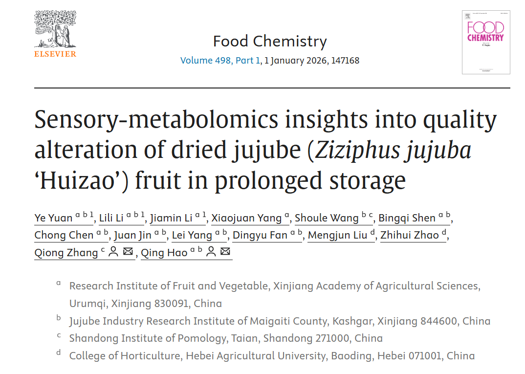 近日,自治区农科院果蔬研究所红枣育种与栽培创新团队在国际知名学术期刊《Food Chemistry》(IF=9.8/Q1)上发表题为“Sensory-metabolomics insights into quality alteration of dried jujube (Ziziphus jujuba‘Huizao’)fruit in prolonged storage”的研究论文。研究解析了制干灰枣长期贮存后的综合品质变化和代谢物重构特征,为干制灰枣货架期质量跟踪和生物标志物开发提供了参考。