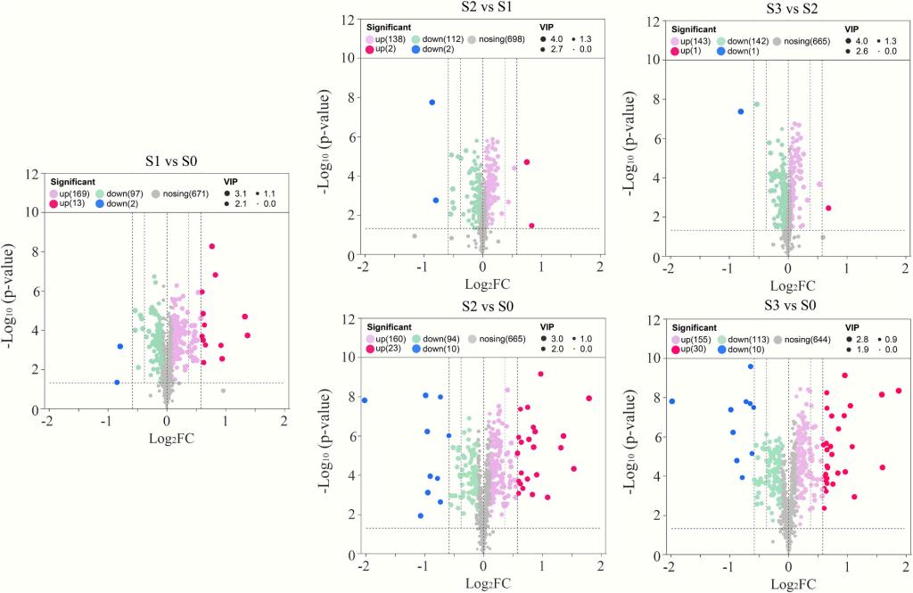 尽管仿生感官分析揭示了多维度的变化模式,但结合挥发性与非挥发性代谢物的类型及含量检测结果,贮藏1年被可视为品质变化的关键节点。贮藏1年后,281种非挥发性代谢物发生显著差异变化,其中32.4%的代谢物丰度变化显著;尤其是枣果特征功能性成分环磷酸腺苷和环磷酸鸟苷的含量在贮藏过程中显著下降。此外,研究初步筛选出具有贮藏溯源潜力及营养/安全风险评估价值的候选代谢物。