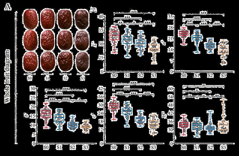 首先,通过色度计分析和目测评估发现,外果皮颜色呈现从鲜红色到暗色调的渐进式变暗,L*、a*、b*和C*值逐年递减,果肉颜色从浅白色a*值逐年显著增加和H◦值下降。果皮在脱水后初期仍保持光滑质地,仅有轻微褶皱,但到S3阶段时,已观察到明显的表皮轻微剥离现象。以上因素共同降低了干枣的商品价值。