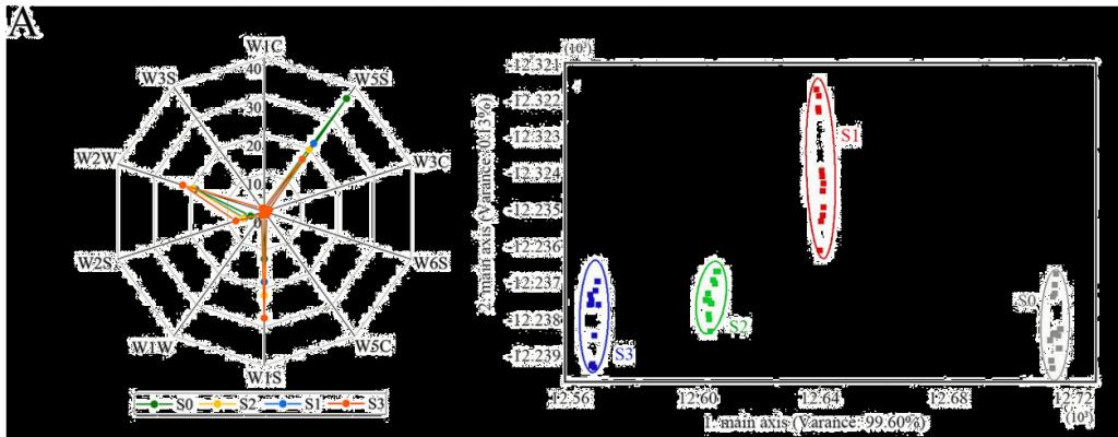 电子鼻检测分析结果显示,金属氧化物传感器W5S、W1S、W2W和W2S均产生强烈响应,其中W5S和W1S传感器的变化最为显著。多元统计分析表明,在比较连续年度变化时,S0与S1在第一主成分上的差异最为显著。在味觉评估中,高于电子舌检测阈的鲜味、甜味、苦味、涩味和丰富性在储存过程中呈现下降趋势,酸味在感官响应中呈现上升趋势但仍低于感知阈值。多元统计分析表明S0、S1和S2样品的相对变化有限且聚类紧密,S3样品出现显著的味觉偏移。