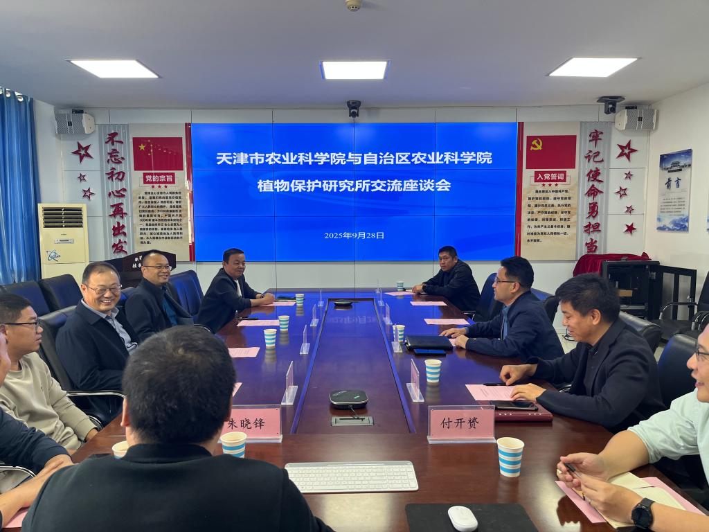 近日,天津市农业科学院党委委员、副院长郭永泽和植物保护研究所所长刘佰明到自治区农科院植物保护研究所座谈交流,植保所所长李广阔主持座谈会,副所长张仁福和团队首席及科研骨干共12人参加会议。