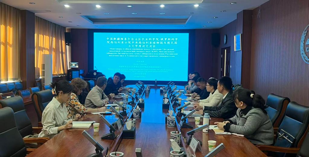 座谈会上,自治区重点研发项目“黑果越橘与沙生蜡菊驯化及规范化栽培关键技术研究与应用”项目负责人乔旭及团队核心成员陈茹等作专题报告,详细介绍了新疆黑果越橘在种苗繁育、组织培养、资源调查等方面的研究进展与成果。俄方专家Evgeny V. Banaev、Mariya A. Tomoshevich、Taigana A.Lama分享了新西伯利亚地区野生浆果种质资源概况,重点介绍了黑果越橘的分布特点与最新研究现状。双方就黑果越橘野生驯化栽培、种质资源交流、创新利用等议题深入研讨,明确了后续合作方向,并现场交换黑果越橘种质资源,为深化合作奠定坚实基础。