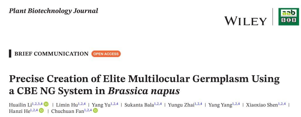 近日,自治区农科院作物研究所油料团队联合华中农业大学作物遗传改良全国重点实验室范楚川教授团队在《Plant Biotechnology Journal》(IF=10.5)期刊上发表题为“Precise Creation of Elite Multilocular Germplasm Using a CBE‐NG System inBrassica napus”的研究论文。该研究成功开发CBE-Cas9NG碱基编辑系统,在甘蓝型油菜中实现精准单碱基替换,成功创制出生长发育正常、单株产量显著提高的甘蓝型油菜多室新种质,解决了“增产不畸形”的育种难题,为油菜高产育种提供了新策略。