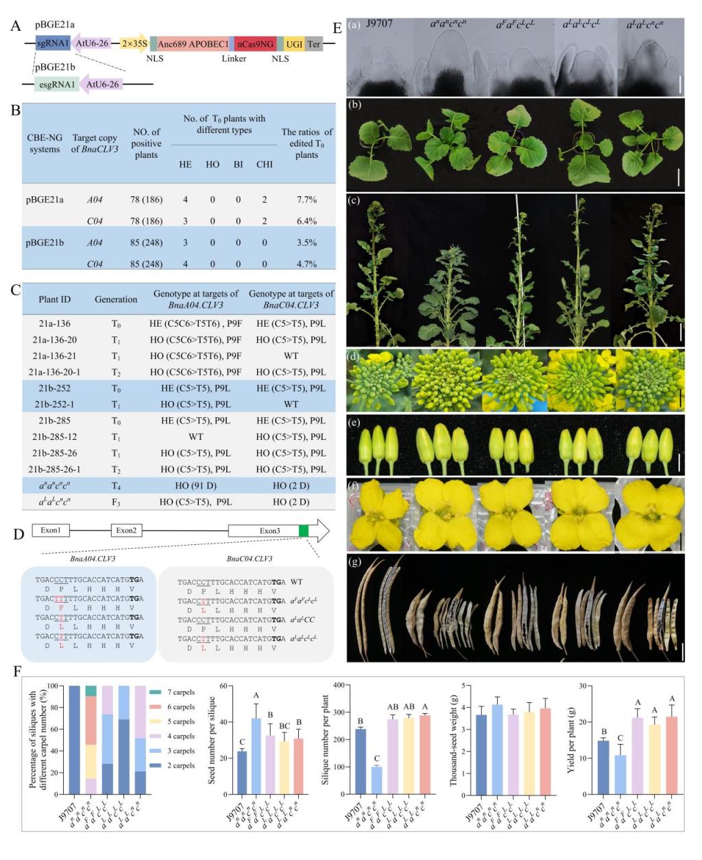 本研究发现,要实现甘蓝型油菜的CLV3同源基因核心CLE基序第9位脯氨酸(PCCT)到亮氨酸(LCTT)的单氨基酸替换,可通过CBE碱基编辑技术来实现。然而,在目标靶点附近没有可用的NGG-PAM序列,无法直接利用传统的CBE碱基编辑系统设计靶点、实现C→T的精准替换。为此,研究团队在甘蓝型油菜中成功建立了可识别NG-PAM的CBE-nCas9系统,并构建了靶向BnaCLV3的两个同源拷贝(BnaA04.CLV3和BnaC04.CLV3)的碱基编辑载体pBGE21a/b。通过农杆菌介导的油菜遗传转化,成功实现了目标位点的C→T替换,获得了两种关键氨基酸变异:PCCT→ LCTT(脯氨酸→亮氨酸)、PCCT→ FTTT(脯氨酸→苯丙氨酸),平均单碱基编辑效率达7.05%。在此基础上,研究团队通过自交和杂交聚合,成功创制了以下3种重要的纯合突变体:aᴸaᴸcᴸcᴸ(BnaA04.CLV3、BnaC04.CLV3均为PCCT→ LCTT)、aFaFcᴸcᴸ(BnaA04.CLV3为PCCT→ FTTT,BnaC04.CLV3为PCCT→ LCTT)和aᴸaᴸcⁿcⁿ(BnaA04.CLV3为PCCT→LCTT,BnaC04.CLV3为敲除移码突变)。与敲除突变体aⁿaⁿcⁿcⁿ相比,碱基编辑株系的叶片数、株型、花器官与野生型J9707基本一致,无发育畸形。平均每角果2.70–3.44室,每角果粒数显著高于野生型(29.26–32.52 vs 23.83)。与野生型相比,单株产量提高29.7%–42.8%,产量提升显著,千粒重无变化。结合拟南芥中的已有研究(CLE基序中的第9位脯氨酸是维持生物活性的关键,但不影响受体结合),这一结果在分子水平上揭示了深刻的逻辑:通过精确替换这一单一氨基酸,仅仅是“温和”地部分削弱了CLV3蛋白的功能。这种恰到好处的活性降低,既足以诱导产生高产的多室表型,又不会因为信号通路的彻底阻断而引发整株发育系统的崩溃。
