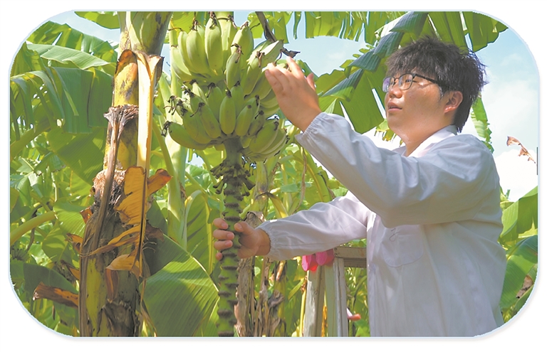 图⑥ 中国热带农业科学院南亚热带作物研究所科研助理李明伟在查看香蕉生长情况。
