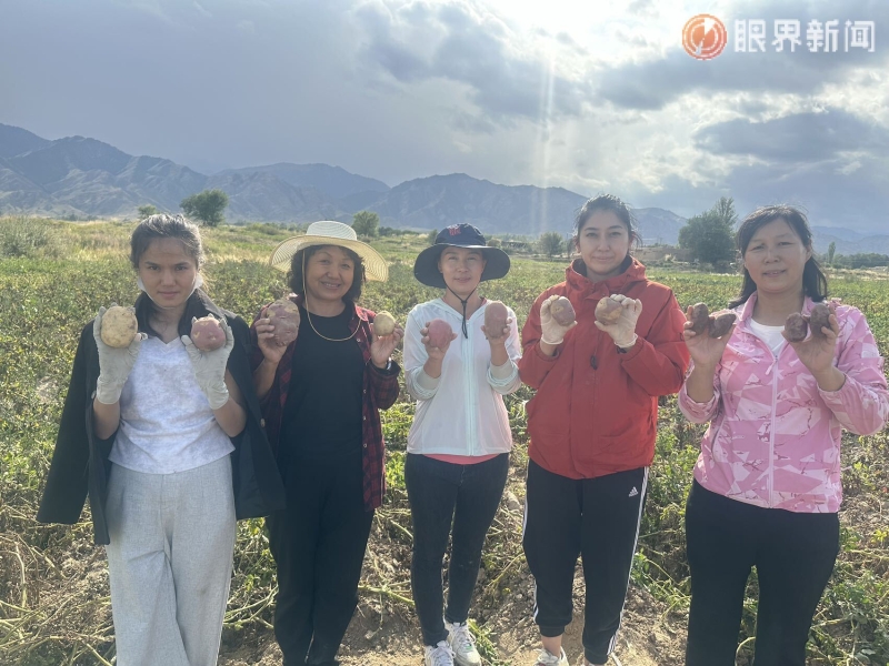 9月10日,新疆昌吉回族自治州吉木萨尔县泉子街镇太平村、新地乡大东沟村国家马铃薯产业技术体系试验示范田,铁锹扬起的泥土中滚出外形美观的马铃薯。