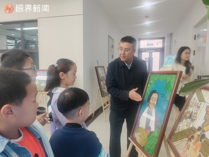 几名小学生正在围观种子画。记者江斌伟摄