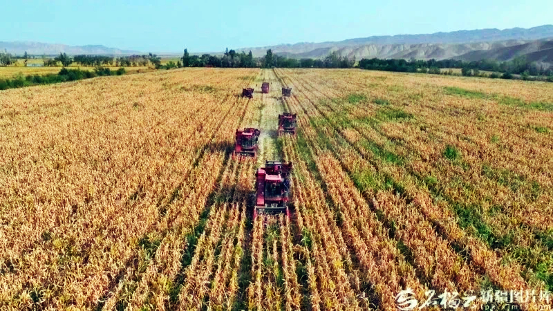 2025年9月末,玛纳斯县包家店镇的制种玉米地里,农机来回穿梭收割玉米,一派丰收的繁忙景象。图/玛纳斯县融媒体中心提供