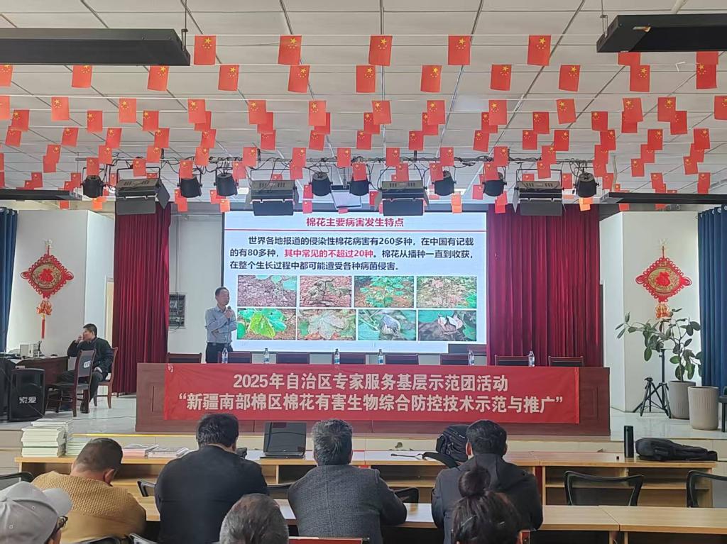 本次示范团活动精准对接南疆棉区产业痛点,特邀中国农业科学院生物技术研究所苏晓峰研究员、河北省农林科学院植物保护研究所赵卫松研究员、石河子大学韩小强教授和杨德松教授及自治区农业科学院植物保护研究所的10位专家组成服务团。专家们通过专题讲座、互动研讨、交流座谈相结合的形式,围绕棉田突出的有害生物突出问题及防控技术短板,展开了深入浅出的讲解与指导。