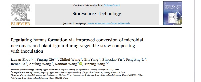 近日,自治区农科院微生物研究所农业有机物处理与资源化利用创新团队在《Bioresource Technology》(IF=9.0/Q1)发表了题为“Regulating humus formation via improved conversion of microbial necromass and plant lignin during vegetable straw composting with inoculation”的研究论文,揭示了好氧堆肥中促进植物和微生物残体向腐殖质碳转化的生物强化机制。